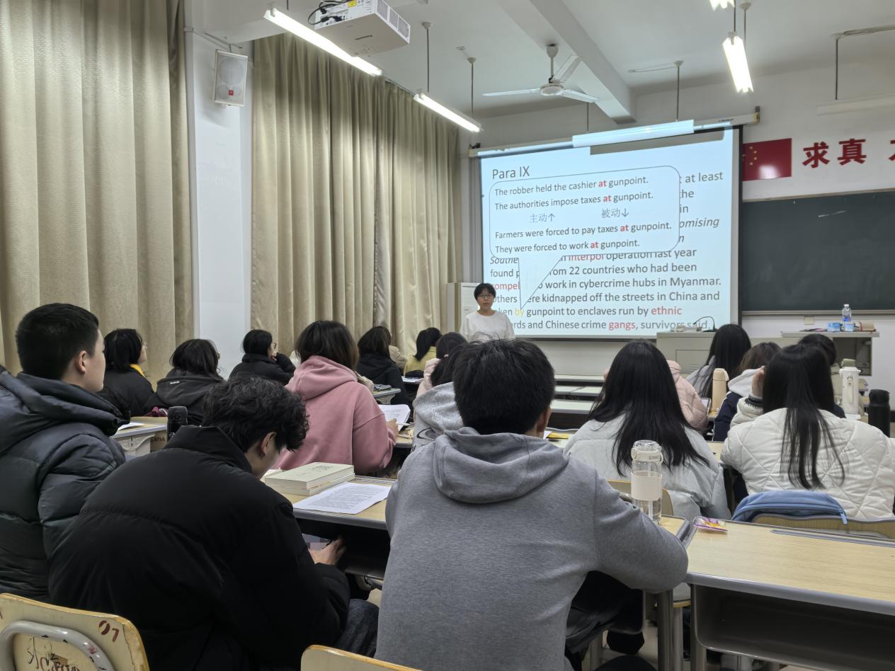 本次开设公开课的教师有蔡江云副教授、许秀玲副教授、黄薇老师、陈姗姗老师以及杨广烨老师。其中,在《综合英语(二)》课堂上,蔡江云副教授先从China Daily每日一词“The Artificial Intelligence Action Summit”热词带领学生学习国家领导人致2024世界智能产业博览会贺信的部分中英文内容,既让学生与时俱进,更是培养了学生笔译的能力与国际视野。在教学中,更是引导学生从不同的角度来分析文本中人物Anne的性格特点,教学内容深度与广度兼具,培养了学生的批判性思维。许秀玲副教授的《综合英语四》注重高阶思维培养,激发学生批判性思考,以任务驱动促使学生语言、思维协同发展。黄薇老师的《语法(二)》将理论知识与大量实例相结合,从日常对话及信手拈来的素材让语法规则跃然纸上。课堂上,黄老师运用思维导图梳理语法脉络,条理清晰,便于学生理解记忆。陈姗姗老师的《时文翻译》紧跟时代脉搏,从词汇的灵活对译到句式的巧妙转换,陈老师板书与PPT演示结合,详细讲解翻译思路。学生们边听边练,在实践中体会翻译魅力。杨广烨老师的《课外英语听说实践》采用“翻转课堂”的混合式教学:课前让学生在平台观看老师录制的教学视频,课上让学生分组进行任务,教师总结性评价。这一方式体现“以学生为中心”的教学理念,深度融合产出导向法评价机制,通过体验式模拟教学与实践教学,有效激发学生参与热情,显著提升自主学习语言表达和成果产出能力,教学成效显著。