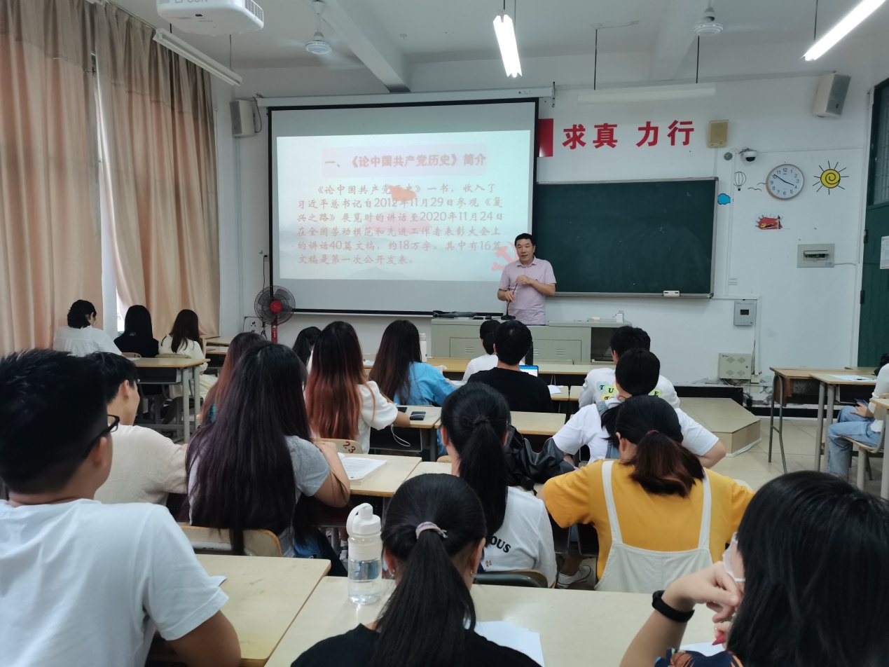 会上,徐晓春同志从《论中国共产党历史》简介、学习背景,重点篇目解读和学习建议四个方面带大家学习该书。在学习的主要解读环节中,结合当前大学生的实际,遴选了《实现中华民族伟大复兴是中华民族近代以来最伟大的梦想》、《牢记初心使命,走好新时代长征路》等四篇文章进行重点解读。在《中国革命历史是最好的营养剂》这一篇目中,他着重介绍了背景知识,由背景引向内容,带大家进一步理解习近平总书记在河北调研指导党的群众路线教育实践活动所说的话,理解领会“两个务必”的深邃思想和战略考虑,强调大学生务必谦虚谨慎、不骄不躁,传承艰苦奋斗的作风,强化学习,锻炼能力,为更好的服务国家建设奠定基础;在解读《庆祝改革开放四十周年大会上的讲话》这一篇目时,结合当今中国的繁荣发展,让大家感受到党带领全国各族人民取得改革开放伟大成就的荣耀,并强调改革是一次伟大的觉醒,是一次伟大的革命,也是一次伟大的理论创新,号召大家深入领悟改革弥足珍贵的精神财富,勇于创新创业,实现自我价值。