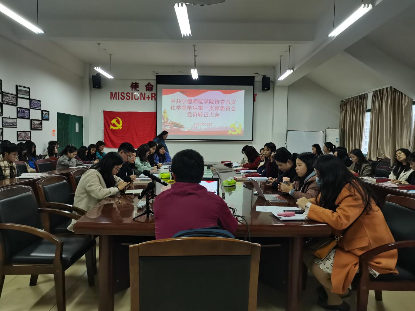 首先,全体参会人员面向党旗唱《国际歌》。之后,许烨颖等九名预备党员先后宣读了转正申请书,汇报了自己预备期间的思想、工作、学习等方面表现,剖析了自己的缺点和不足,表明了自己的态度和决心。她们的入党介绍人挨个分别向大会介绍了其预备期的表现情况。林猤代表支委会通报了预备党员预备期的教育和考察情况。参会党员逐一对预备党员思想政治及现实表现发表意见。在充分讨论的基础上,分别对以上九名同志转正事宜采取不记名投票方式进行票决,与会党员一致同意许烨颖等九名同志按期转为中共正式党员。