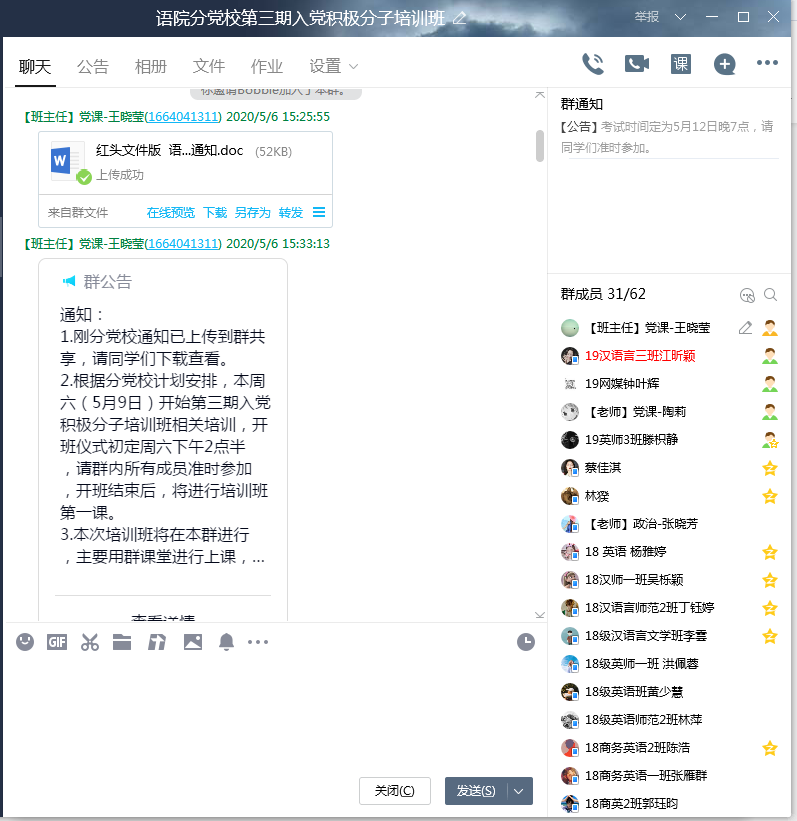 2020年5月9日下午3点,yh1122银河国际分党校以线上QQ直播形式举办了宁德师范学院党校yh1122银河国际分党校第三期入党积极分子培训班开班仪式。参加此次开班仪式有学院党委书记张晓芳,党委副书记陶莉,党委秘书王晓莹,学生党支部书记林猤、祁燕苹、徐晓春以及本期参训的57名入党积极分子。本次开班仪式由学院党委副书记陶莉主持。