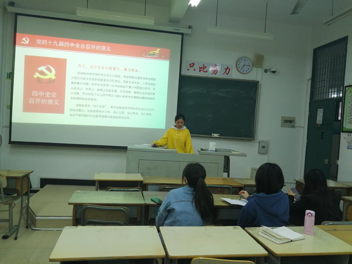 会上,党小组成员针对党的十九届四中全会精神,结合自身经历积极开展讨论。预备党员邵秋丽说:“通过小组学习,我对十九届四中全会精神有了更深刻的理解,坚持党的领导,是中国特色社会主义最本质的特征和最大的优势,正是因为坚持党的领导,国家治理体系才能不断完善,治理能力才能不断提升。作为一名预备党员,我要听党话、跟党走”。之后,大家畅谈观看“伟大历程、辉煌成就——庆祝中华人民共和国成立70周年大型成就展”心得,踊跃发表自己的感想。在交流中,党小组成员陈健说,“作为一名大学生党员我们要奋斗为先,敢为人先,滴水穿石,久久为功,为中华民族复兴中国梦做出自己的贡献。”