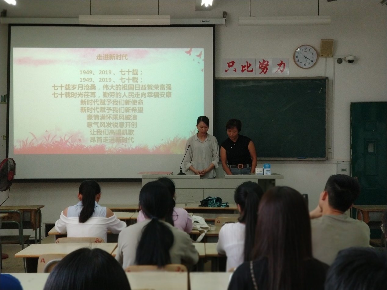 党支部成员还一起观看了诗朗诵视频《可爱的中国》和《天安门广场万人齐唱国歌》,并在王晓莹、何海菊老师的带领下朗诵了《七律·长征》、《可爱的中国(节选)》、《走进新时代》。
