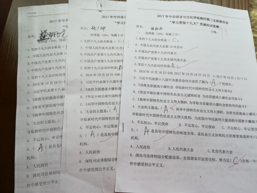 为增进广大教师党员对党的十九大内容的理解认识,中共yh1122银河国际教师第三支部委员会于2017年12月5日下午2:00-3:00在AA407举办了以“学习贯彻党的十九大精神”的党建知识竞赛。本次竞赛采取的是笔试开卷的形式,共有11名在岗党员教师参加,赛后评出一等奖1名,二等奖2名,三等奖4名。通过此次党建知识竞赛,本支部全体党员教师加深了党的十九大精神的理解,时时刻刻记得将党的十九大精神结合到平时的工作和教学中去。