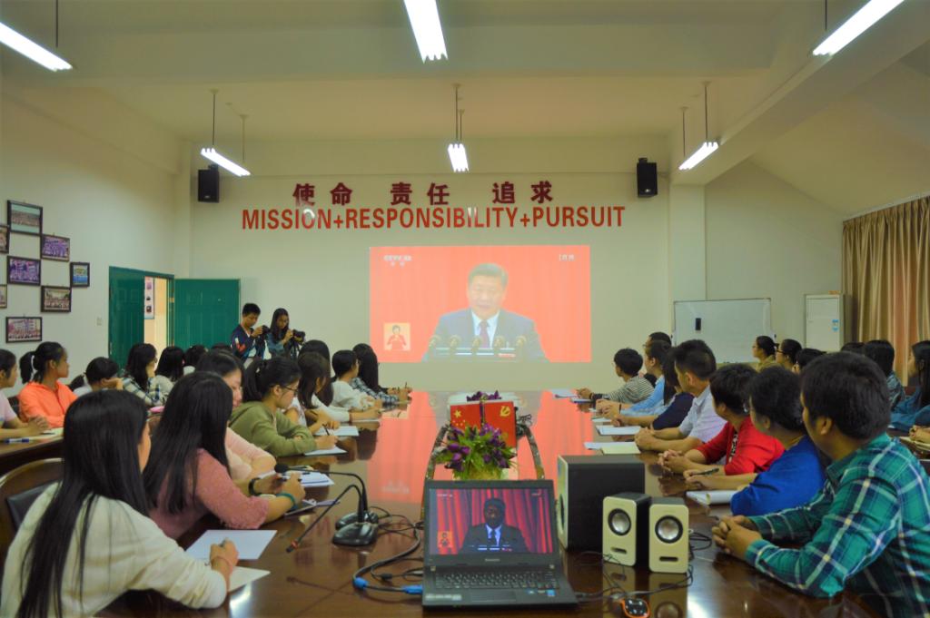 习近平新时代中国特色社会主义思想 2017年10月18日上午9时,中国共产党第十九次全国代表大会在北京人民大会堂隆重召开。yh1122银河国际党委在求知楼AA407组织师生集中收看中国共产党第十九次全国代表大会开幕式现场直播。学院党政班子成员、教师代表、辅导员和学生代表60多人参加观看。