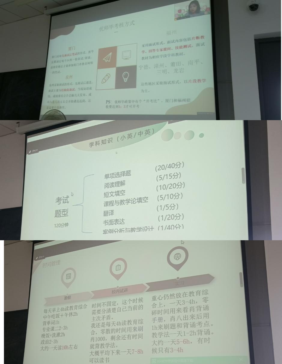 在考研经验分享环节中,李传秋学姐首先强调了时间管理的重要性,其次分享了各科的备考经验和备考教材。最后强调了保持良好心态和规律作息的重要性,并鼓励大家积极备考。在考编经验分享环节中,阮爱莹学姐分别从笔试和面试两个模块入手,分享了相应的备考策略,并提供了一些好用的备考教材和资源,供同学们参考。在校招经验分享环节中,黄宇昕学姐从如何界定优秀师范毕业生,关于优秀师范毕业生的建议,关于校招的建议等方面入手,强调了在校期间努力提高专业成绩的重要性以及参加大学生创新创业大赛等活动的必要性。在分享会的最后,几位学姐都强调了心态的重要性。她们表示,无论是考研、考编还是校招,都需要有一颗坚韧不拔的心。面对困难和挑战时,要保持积极的心态和坚定的信念,相信自己一定能够成功。同时,她们也鼓励学弟学妹们珍惜大学时光,努力学习、积极实践、提升自己,为未来的职业生涯打下坚实的基础。