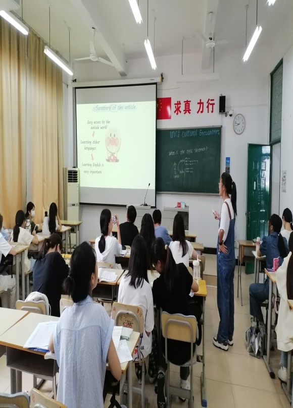 此次公开课的授课对象为2023级英语(师范)1班学生,此次课堂主要为学生团队作业的展示课。第七组同学(周兰、曾琪、刘丁萃和黄月瑶)从Lead-in,New Words, Text Analysis 和Summary四大教学环节对第八单元Cultural Encounters做了精彩的教师技能展示。之后,其他六组组长对该组做了精彩点评和评分,最后蔡老师对该小组的四个小老师一一做了很详细的点评和教学建议。