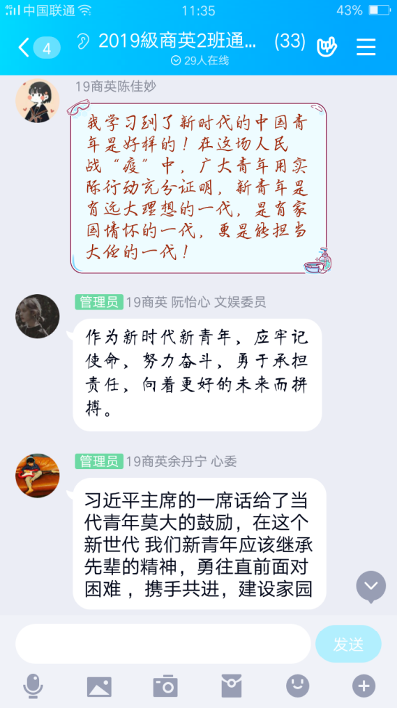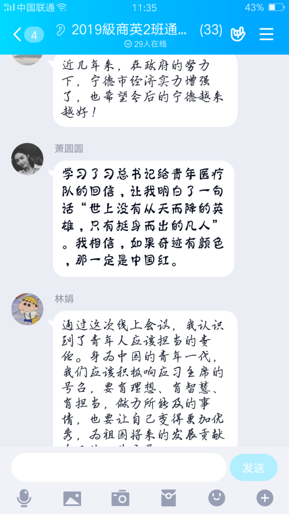 在活动中同学们积极参与,踊跃发言,学习分享了许多关于“五四精神”“抗疫英雄”的相关知识,还交流分享了心得体会,受益菲浅。2019级商务英语2班的团支书苏清苑说:“回首新中国建设的伟大征程,无数爱国青年抛头颅洒热血,为祖国建设贡献出自己的力量。而在此次新冠肺炎疫情防控斗争中,新一代青年同在一线英勇奋战的广大疫情防控人员一道,不畏艰险、冲锋在前、舍生忘死,彰显了青春的蓬勃力量,交出了满意的答卷,书写战疫青春。在宁德市艰苦探索的发展历程中,中国青年同样起到了很重要的作用。距离宁德撤地立市已经二十周年,二十年来,宁德发生了翻天覆地的变化,闽东地区经济飞速发展,福建不断走向繁荣。作为新时代新青年,我们更应接好接力棒,努力拼搏,勇担责任,始终坚持党的领导,坚定制度自信,弘扬闽东之光。”