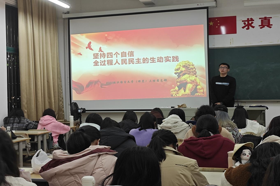 主题团日活动上,各团支书通过视频和举例的方式,向同学们具体介绍了“四个自信”的内涵和全过程人民民主的意义,引导同学们认识到中国特色社会主义的优越性。坚定四个自信对当今大学生意义重大,激发当代青年的担当精神,增强国家荣誉感,培育浓厚的爱国情怀,推动当代青年为实现中国梦奋勇前行。