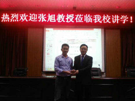 讲座一开场,张旭教授便以视频的形式,把全体师生带入了他的讲座。视频是关于福建工程学院人文学院的学校风光,短短的十几分钟让大家都深刻体会到人文学院优秀的学校风采、教师风采以及学生风采。于是张旭教授以友之名赠送我系龚帆元主任视频U盘并合影留念。接着,张旭教授分享了他在福建期间的新成果、部分研项目,其中的一部《风筝不掉线》便是他的著作。张旭教授还介绍了演绎法、归纳法等翻译学的有关知识方法,并鼓励我们对待知识要不断归纳、不断积累,要在广泛阅读的基础上培养自己独立思考、独立判断的能力,避免人云亦云。从现在开始,实实在在的做起,他坚信有心的人一定会成功,这让在场的全体师生都受益匪浅。然后张旭教授给我们分享了一系列诗歌鉴赏,并总结说每个人要有自己的特色,与别人不一样的特色,再全方面发展自己。最后,张旭教授表示希望我系学子能在未来中走向优秀,成就更好的自己。