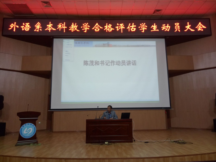 为了迎接本科教学工作合格评估专家入校,创建更加美好的生活学习环境,11月9日晚6点半,英语系迎接本科教学工作合格评估学生动员大会在图书馆报告厅举行。英语系党总支书记陈茂和、副主任黄荣生、辅导员元佳珺、王晓莹出席了本次会议,并分别上台讲话。英语系全体学生参加了此次会议。