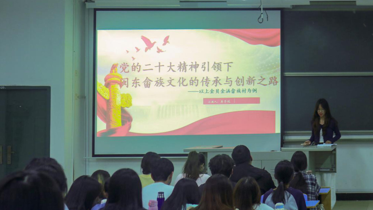 吴予悦围绕《党的二十大精神引领下闽东畲族文化的传承与创新之路研究——以上金贝金涵畲族村为例项目的金贝金涵畲族村》项目,分享了实践过程中的田野调查与社会访谈经历,分析了制约因素及调整策略,介绍了文化与影视、旅游融合等创新案例。