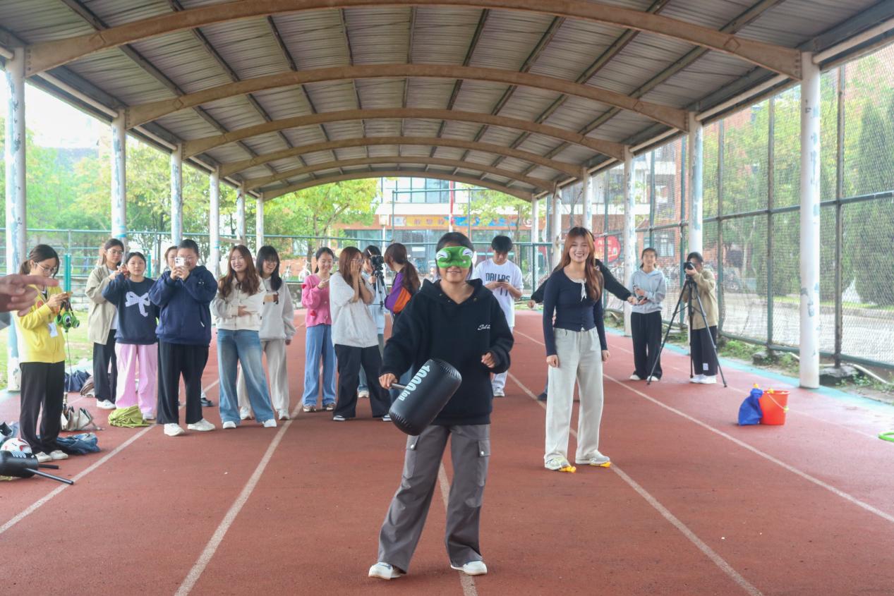 在蒙眼尖叫鸡环节中,参与者脚踩尖叫鸡,小心翼翼避免发出声音,蒙眼者手持气锤,对着声音的来源挥舞,工作人员会对蒙眼者进行提醒,避免超出范围,并确保活动安全。在规定时间内,根据蒙眼者击中的次数进行得分。