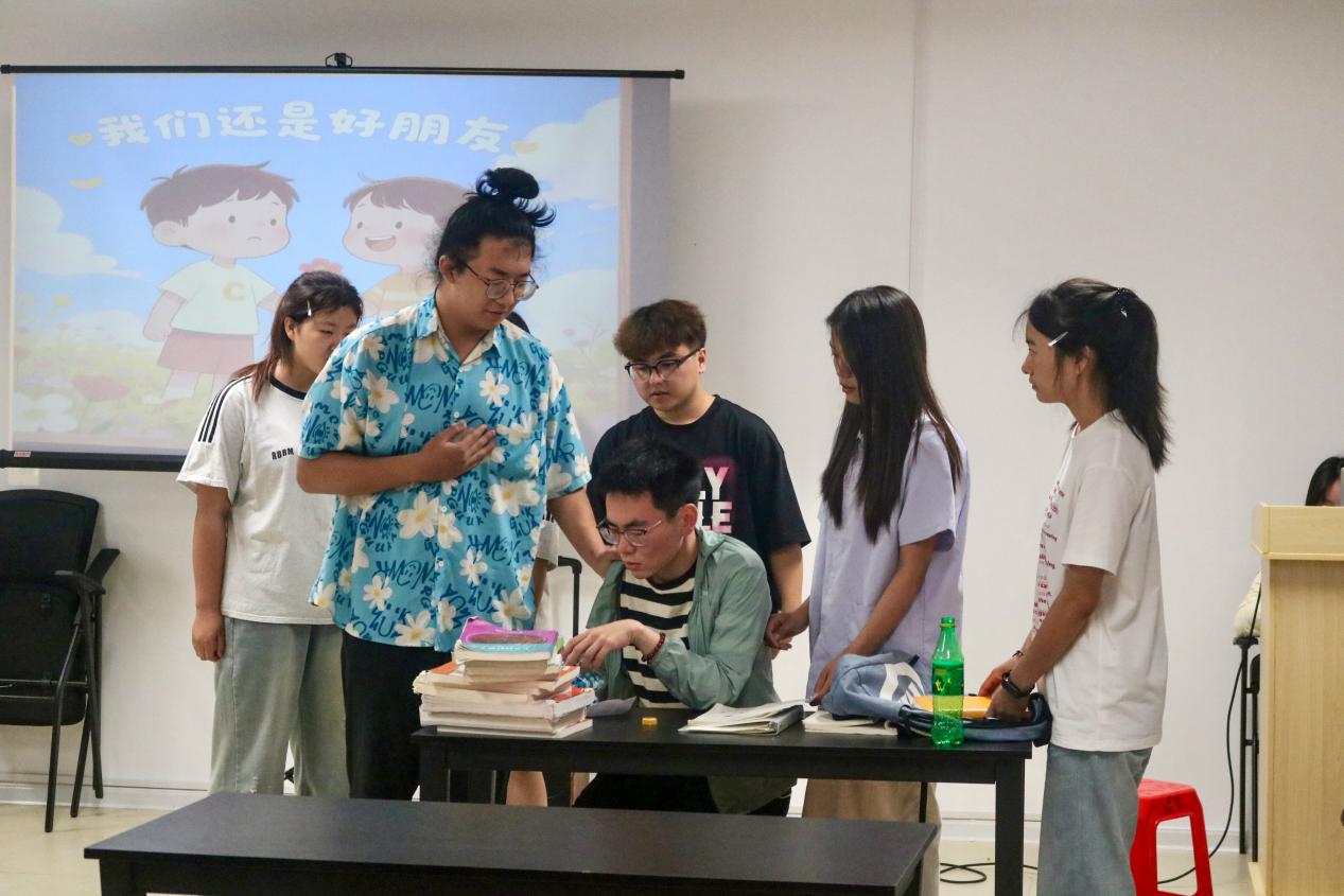 比赛现场,参赛队伍聚焦友情、自卑等现实话题,演绎大学生的心理成长历程。24级汉语言文学(师范)一班的作品《内耗》刻画了大学生因同学比自己优秀而产生的内心焦虑与自我内耗,展现了当代学生在竞争环境下的心理困境与成长感悟。